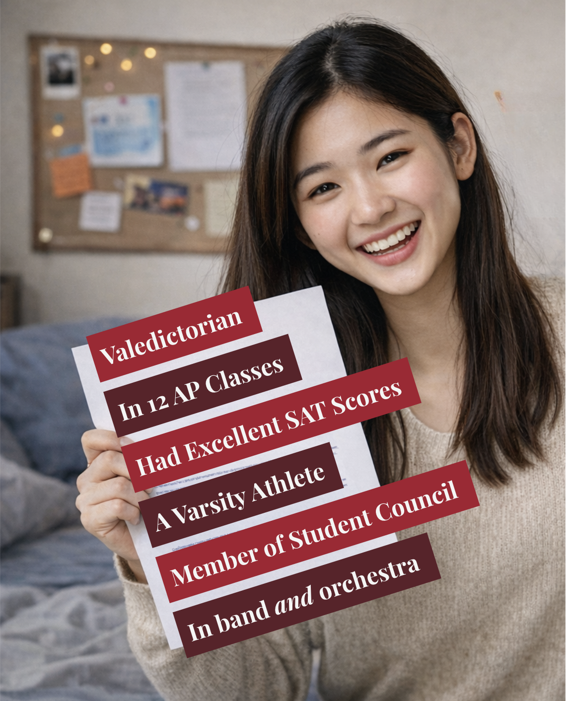 The result: Rejected by Stanford and every Ivy League school she applied to.
