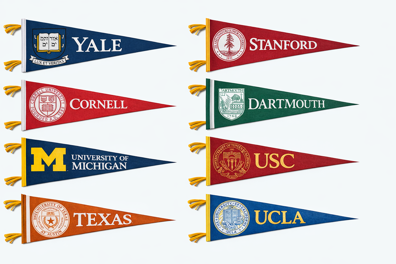 (Yale, Cornell, Dartmouth, Stanford, Harvard, University of Michigan, UT Austin, UCLA, USC)