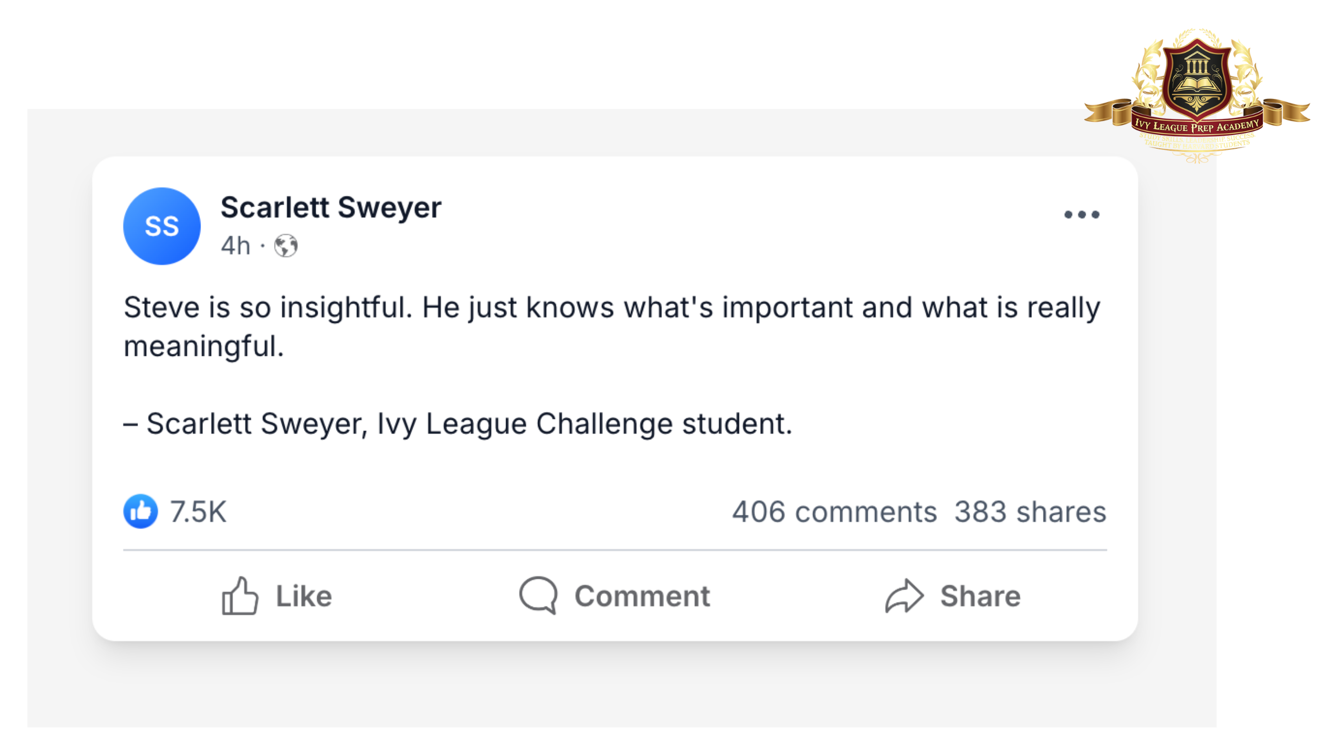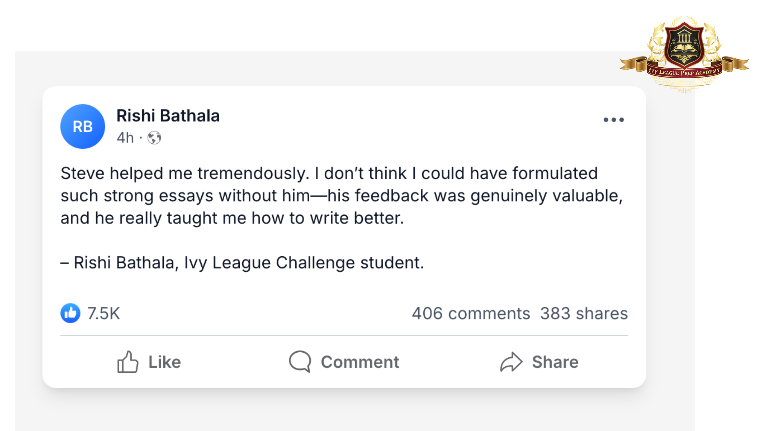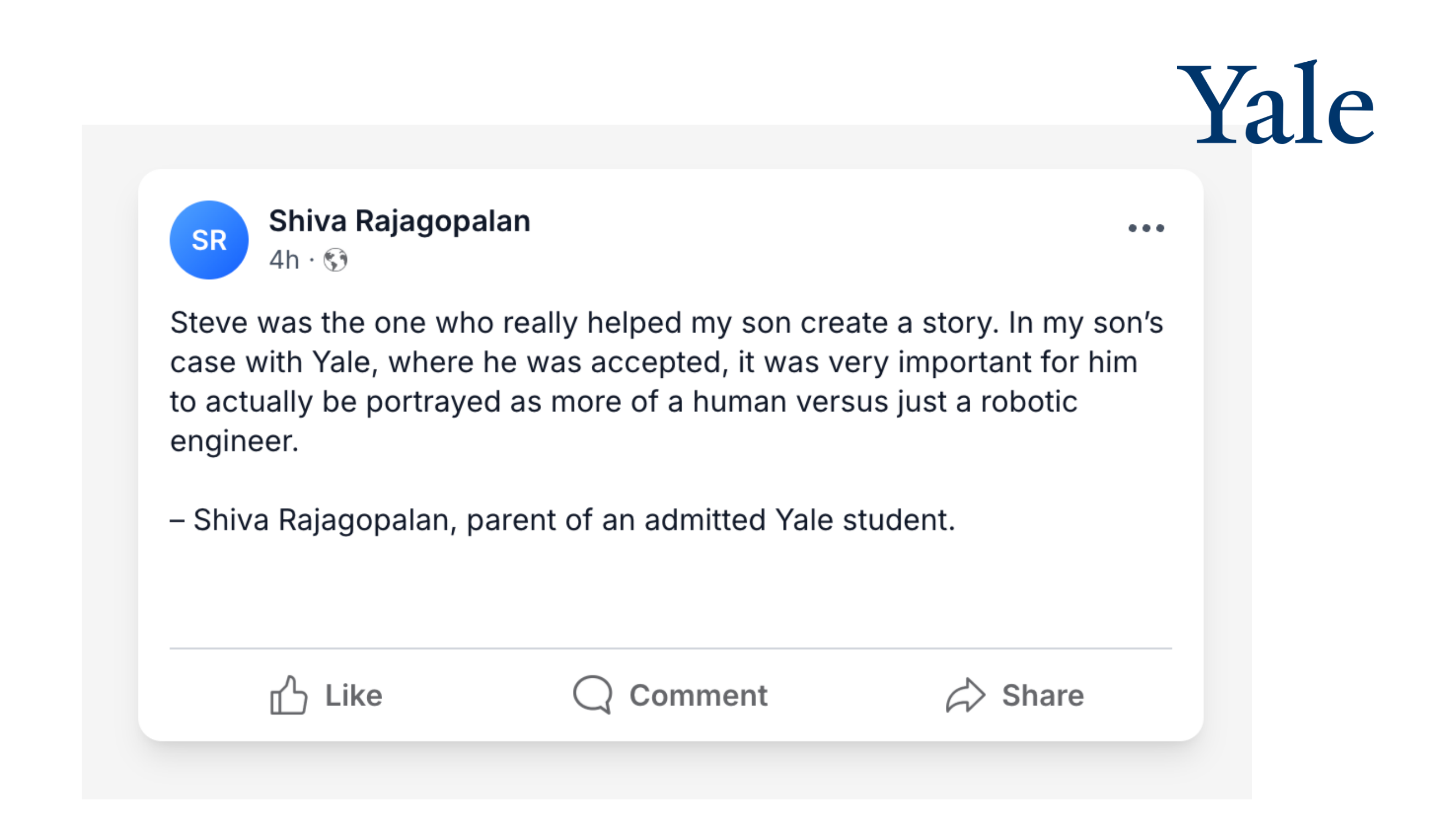 About 40% of our students are aiming for top-tier schools. The other 60% want to be more competitive for scholarships or simply want to align their life with their core values. Both groups benefit from the same process: clarity about who you are and evidence that you make things better.